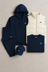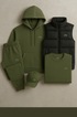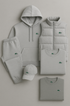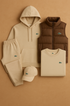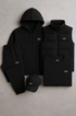 Discover the effortless elegance of Lacoste with this complete set including a hoodie, joggers, a t-shirt, a quilted vest, and a matching cap.